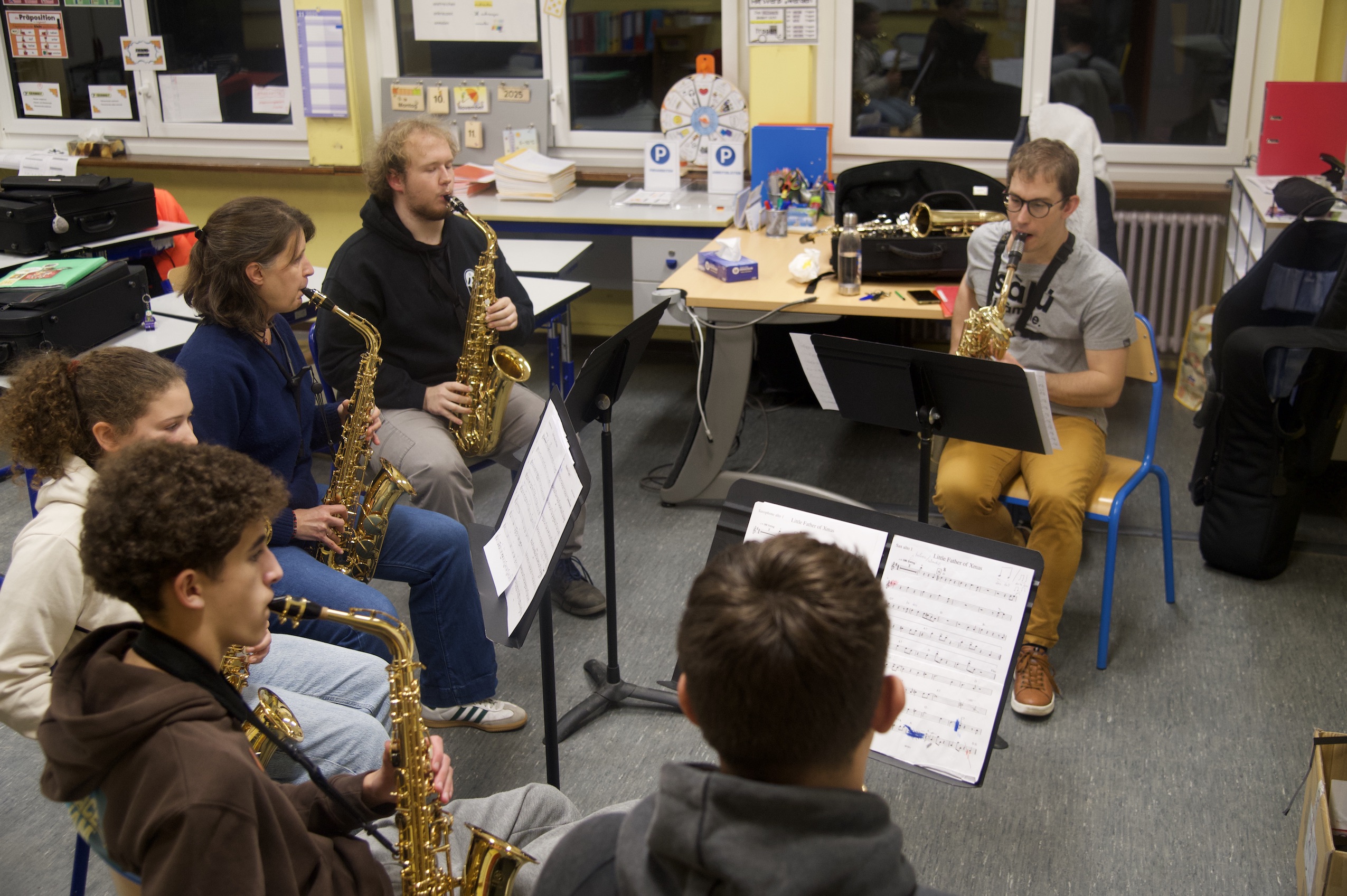 Rémi Psaume, professeur de saxophone à l’école de musique de Wolfisheim, fait répéter ses élèves de l’ensemble de saxophone. © Colin Berson