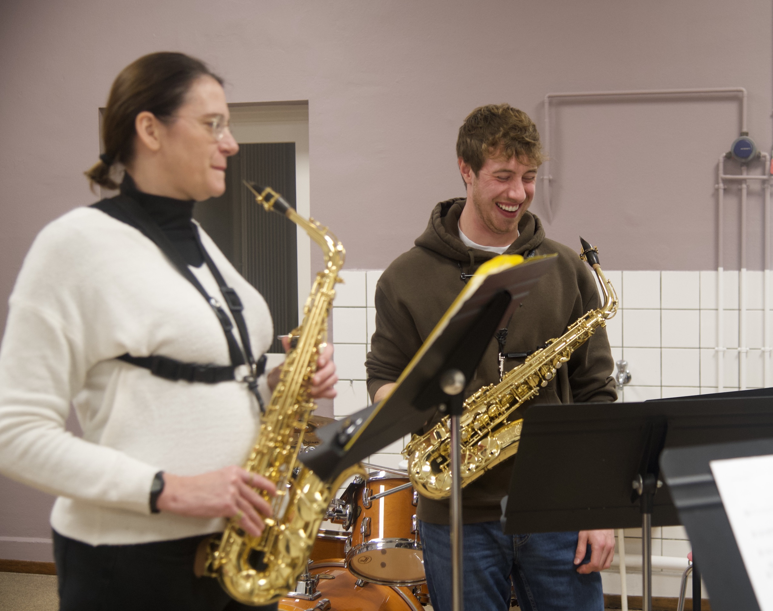Sean McGinley, à droite, imprime une atmosphère détendue lors de son cours de jazz du jeudi soir, à l’école de musique d’Eckbolsheim. © Baptiste Domergue