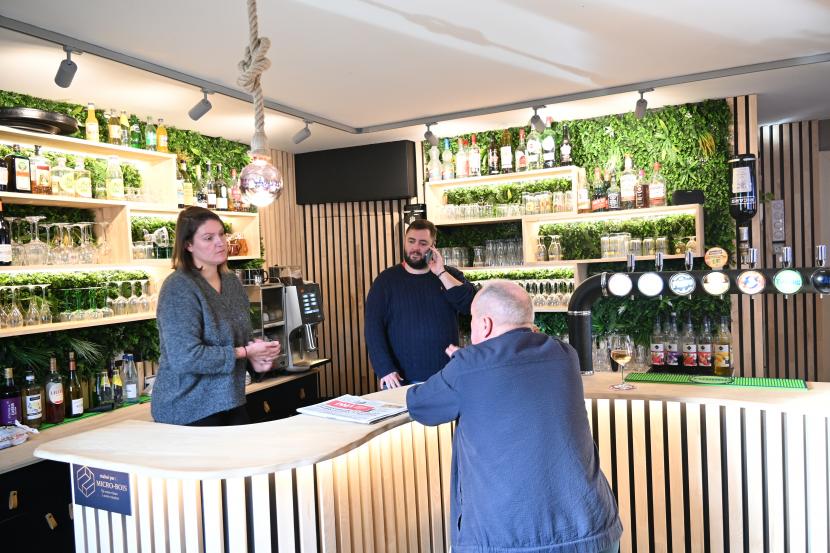 Alix Gremmel et Maxime Schell, gérants du bar, discutent avec un client. © Arnaud Fischer