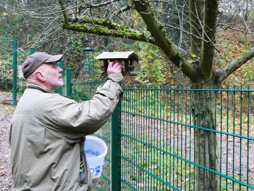 Théodore Dettmann, bénévole de l’association La Basse-cour du fort Kléber, remplit une mangeoire à oiseaux. © Emeric Eymet