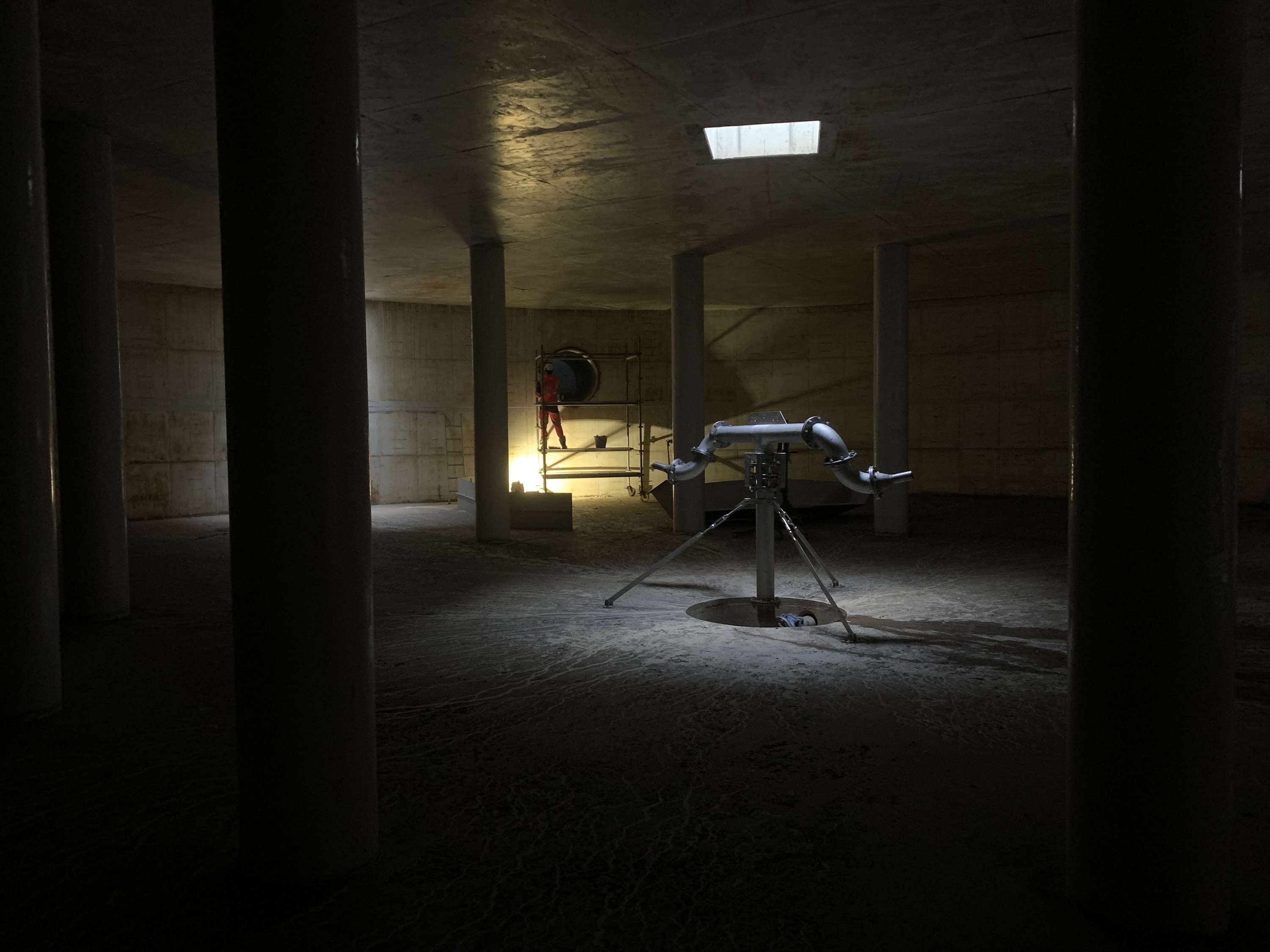 Le godet du tractopelle qui sort de terre laisse apparaître la percée de l’évacuation du bassin d’orage au sud de Wolfisheim. Un bruit sourd retentit depuis l’escalier qui s'engouffre dans l'ouvrage souterrain. À l’intérieur, d’immenses colonnes soutiennent l’édifice circulaire capable de stocker 1750 m³ d’eau.