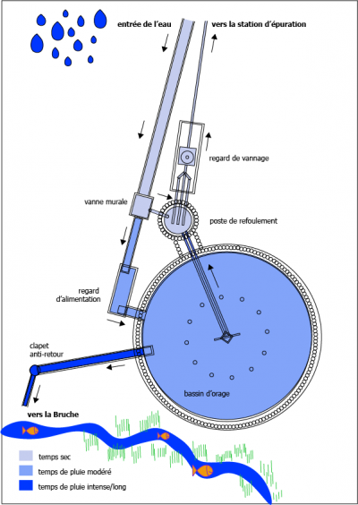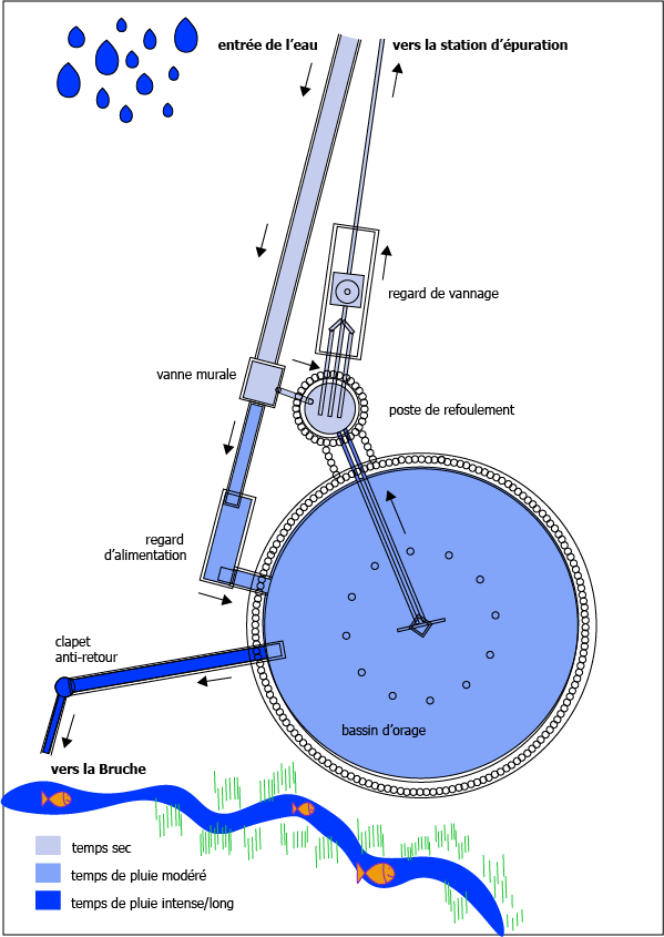 Aussi appelé bassin de dépollution, l’ouvrage permettra à l’EMS de respecter les quotas de rejets du système d’assainissement imposés par l’Union européenne depuis 2000 pour un retour au bon état des masses d’eau d’ici 2032. Depuis 2015, seuls 5 % des rejets résiduaires urbains dans les rivières sont autorisés. D’après des modélisations réalisées par l’Eurométropole à partir des données pluviales de 2014, 12,4 % des volumes d’eaux usées ont été déversés dans le milieu naturel cette année-là. “Après les travaux, le chiffre annoncé est de 4,1 % : on a quand même une grande amélioration”, se réjouit Élodie Mélart, pilote d’opération du schéma directeur d'assainissement à l’EMS. “En solution béton-tuyau, on arrivera difficilement à faire mieux”, commente Éric Heitzmann. D’autant plus qu’en ruisselant, l’eau de pluie se charge en pollution pour finalement être nettoyée en station d’épuration.