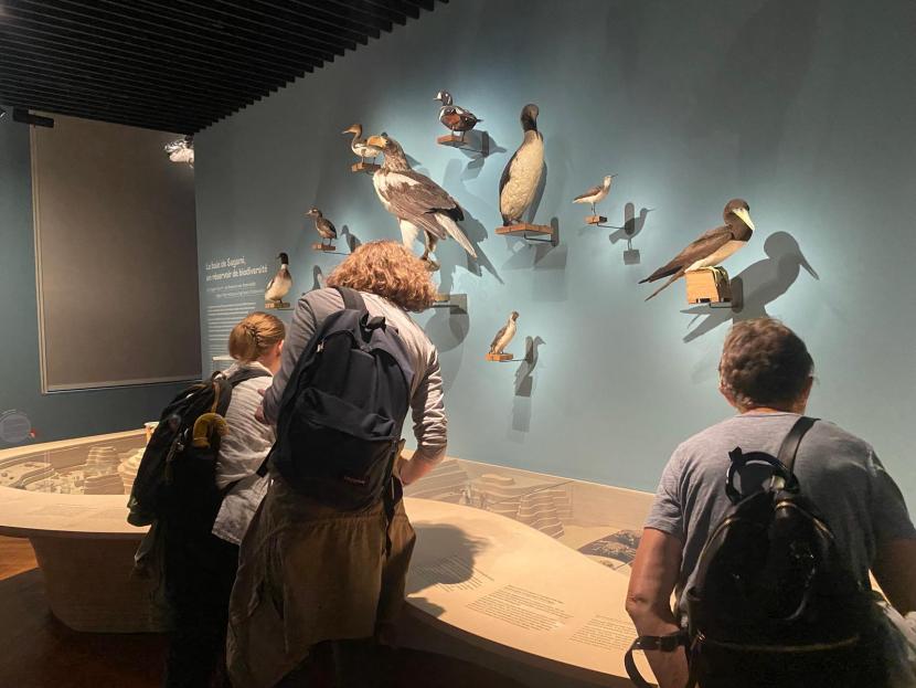 Dans la première salle, dédiée à la biodiversité, Guillaume Laugel (au centre) s’intéresse aux différentes espèces d’oiseaux. © Anouk Seveno