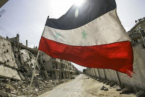 Le drapeau syrien flotte sur les ruine de Homs. En quatre ans, la guerre a fait au moins 140 000 morts. (JOSEPH EID/FLICKR)