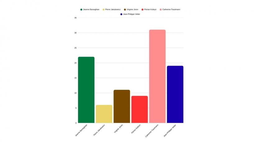 Catherine Trautmann serait en tête pour le Parti socialiste (PS), avec 31% des intentions de vote, suivie par Jeanne Barseghian, la maire sortante encartée chez Les Écologistes, à 22%. Le Républicain Jean-Philippe Vetter la talonnerait à 19%, devant la candidate du Rassemblement national (RN) Virginie Joron, créditée de 11%. Florian Kobryn, lui, offrirait à la France insoumise (LFI) un score de 9% au premier tour, tandis que Pierre Jakubowicz, étiqueté Horizons, grappillerait 6% des suffrages.